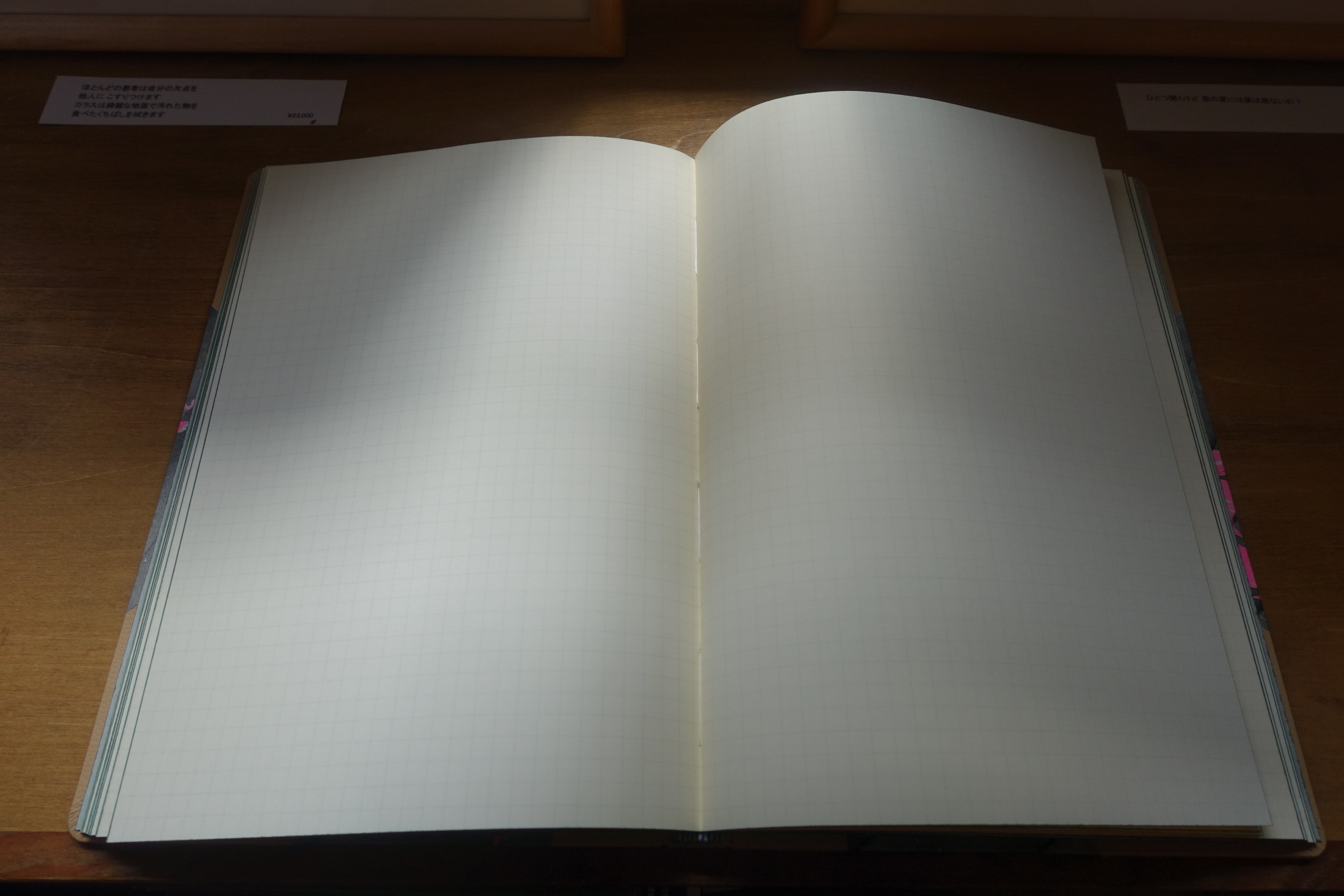 本は全て、手製で制作しております。綴じは糸綴じで、本の開きは非常に良いです。中の紙は方眼紙で、少し黄色味がかっております。装幀のスタイルは、背中と表紙の角に革を用いた、ハーフバインディングと呼ばれるものです。